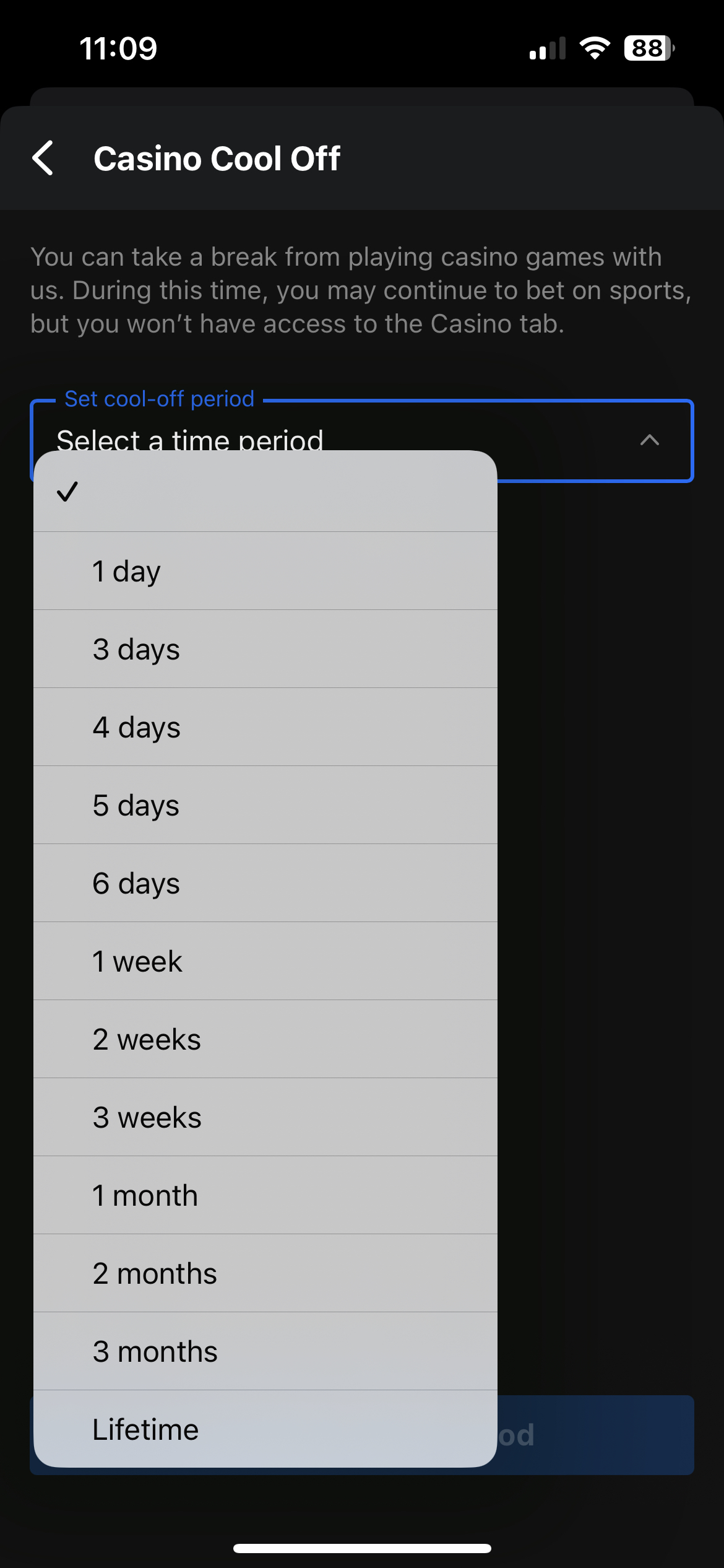 Cool Off - You can take a break from playing with us. Once you set a cool off period for your selected period of time, ranging from 1 day to 3 months, you will automatically be logged out and will not have access to place any bets or make any deposits.