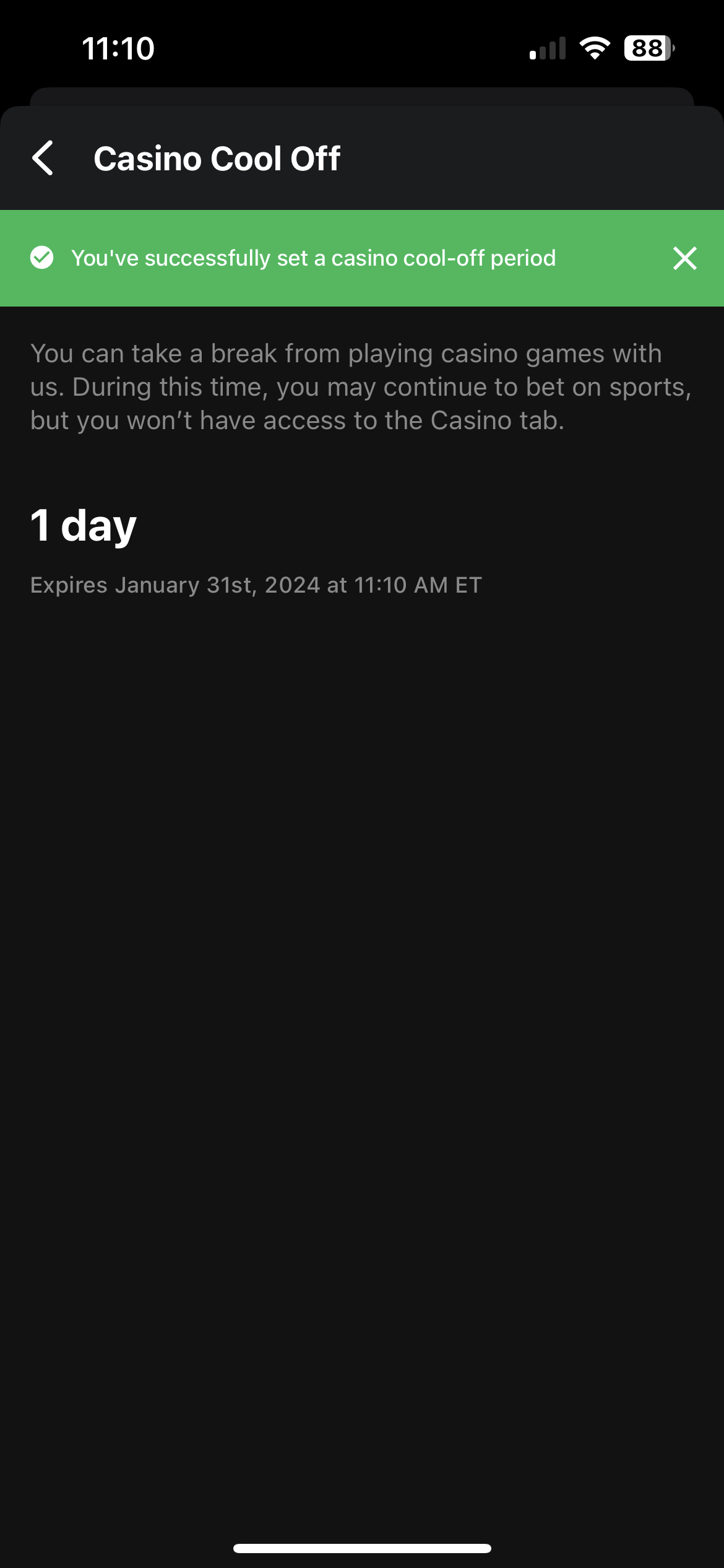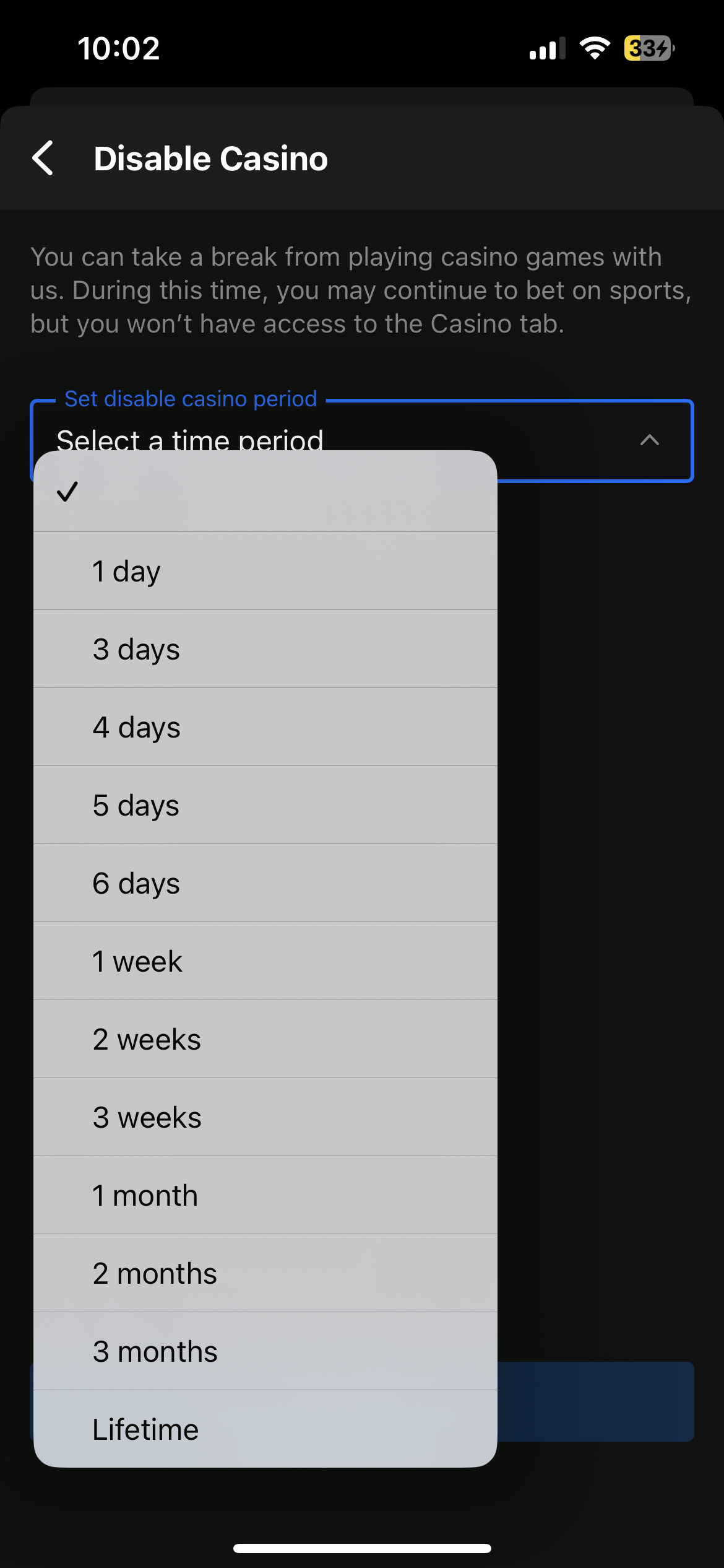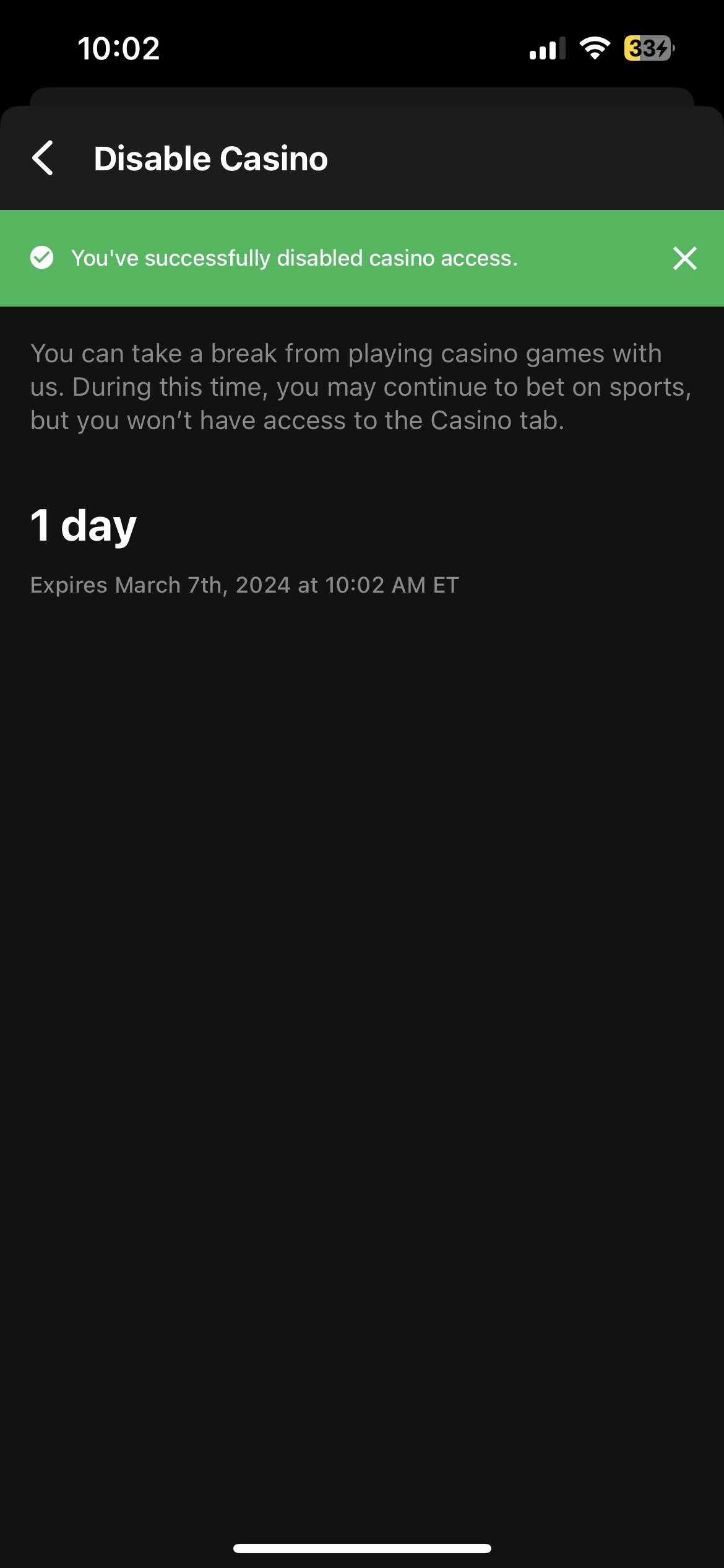 Disable Casino - Take a break from Casino in the theScore Bet app lasting from 1 day to permanently. This feature allows you to continue to wager on your favourite sports teams, but will prohibit you from entering the Casino area or opening any Casino marketing material.